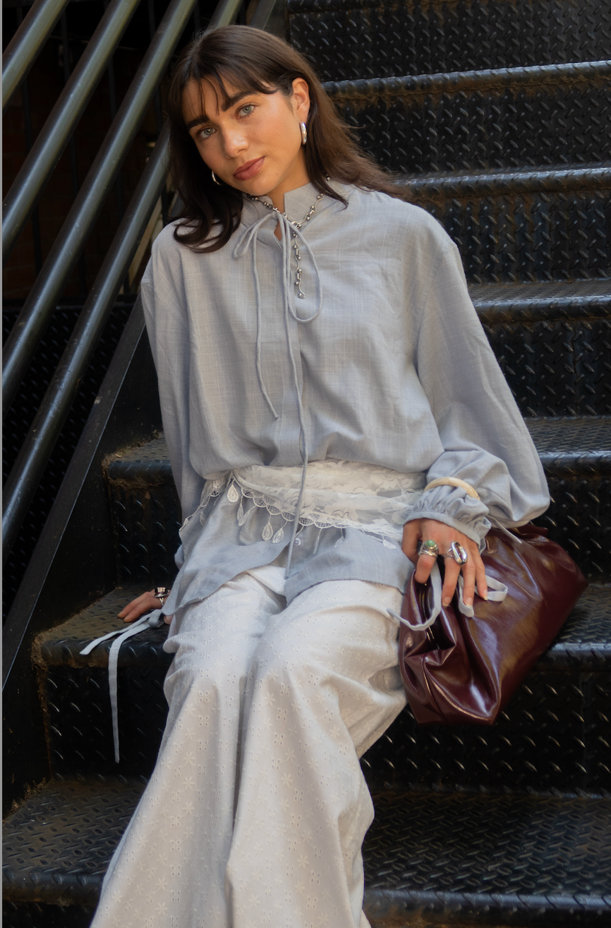 Timeless with a playful twist, the Dalia Blouse is crafted from 100% breathable cotton. The relaxed silhouette features a mandarin collar with tie, gathered sleeves with adjustable ties.