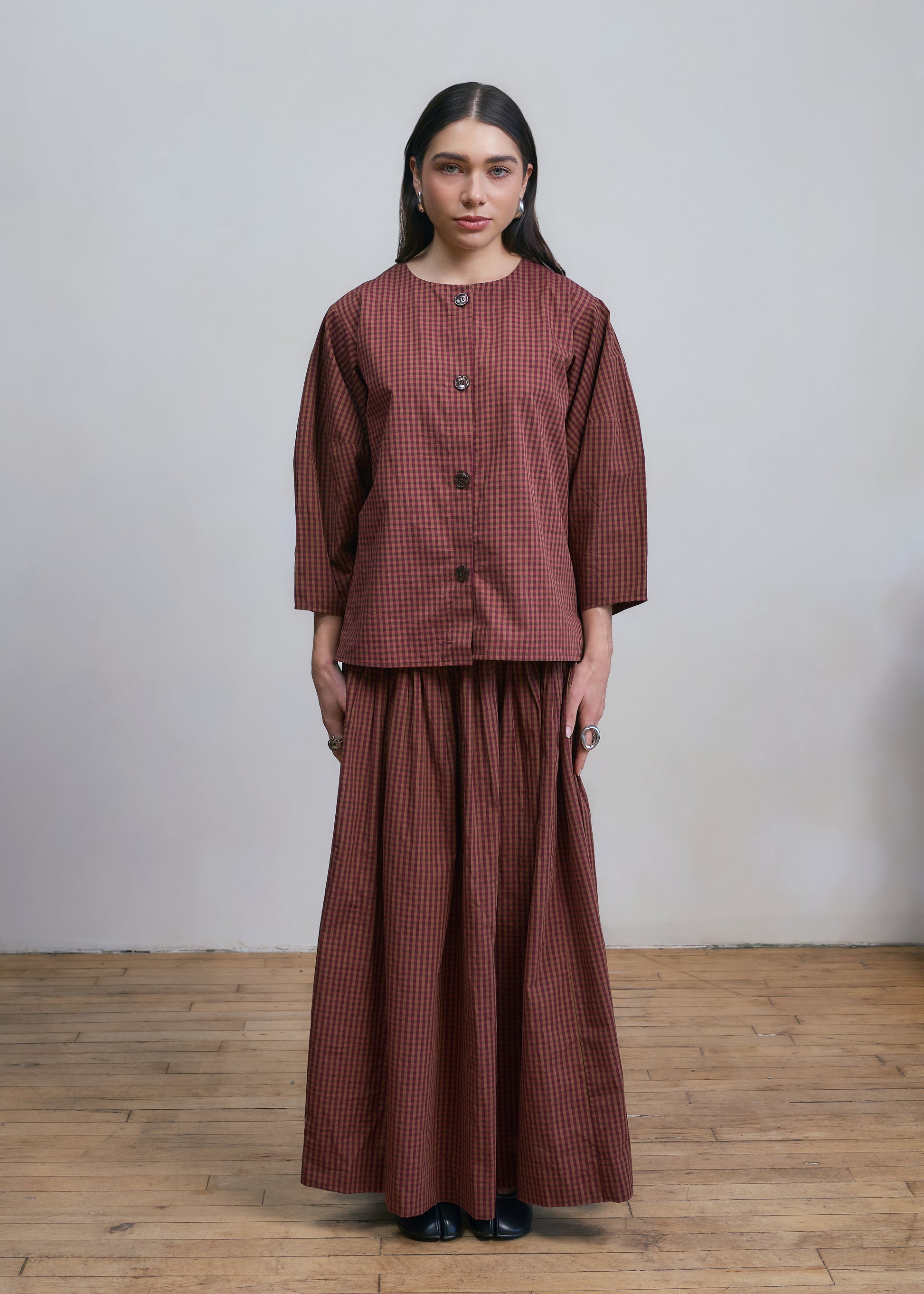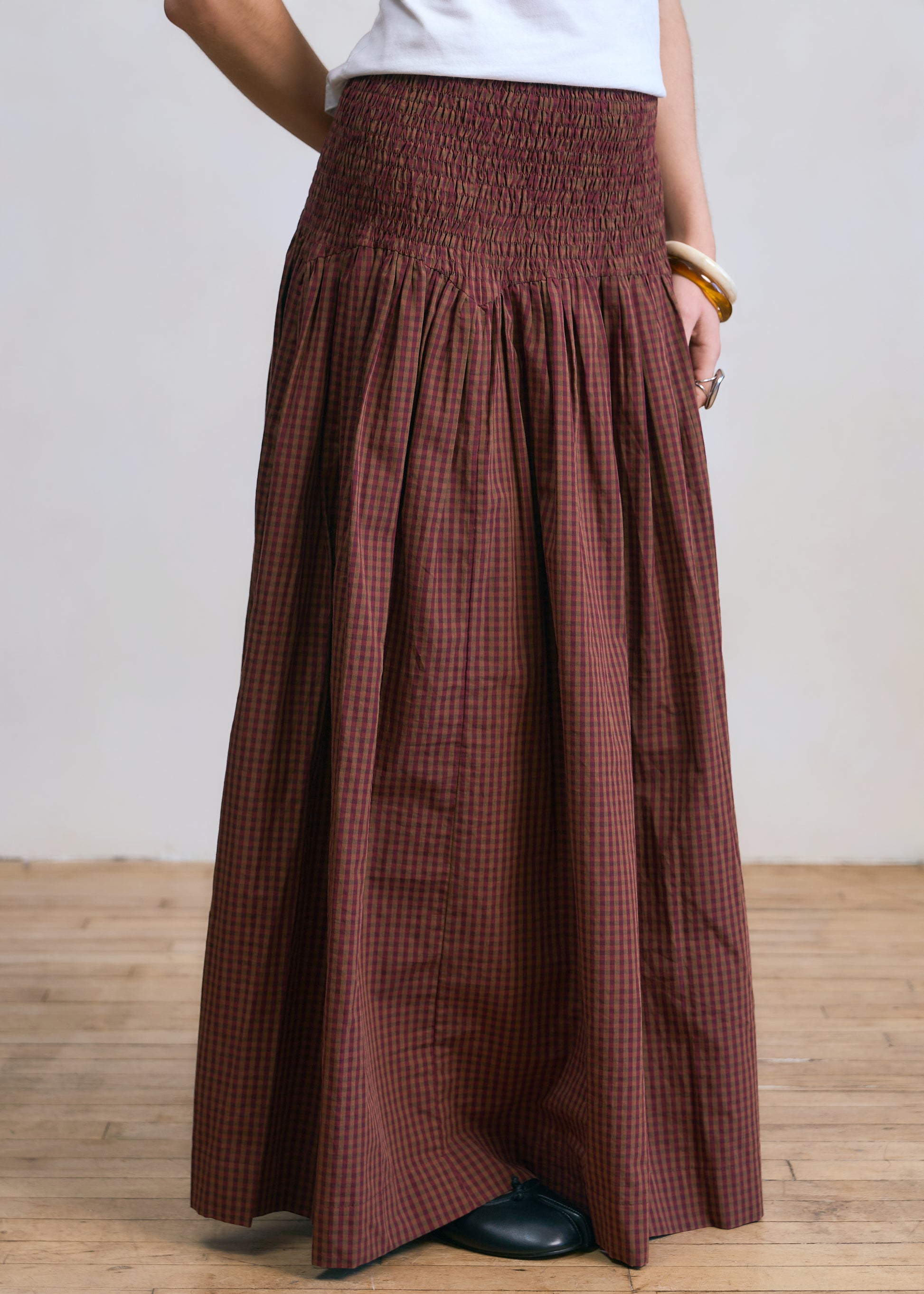 The Castella Skirt is made in our Dhaka Atelier featuring a beautifully gathered silhouette with a wide smocked waist that offers both comfort and effortless, easy to style.