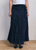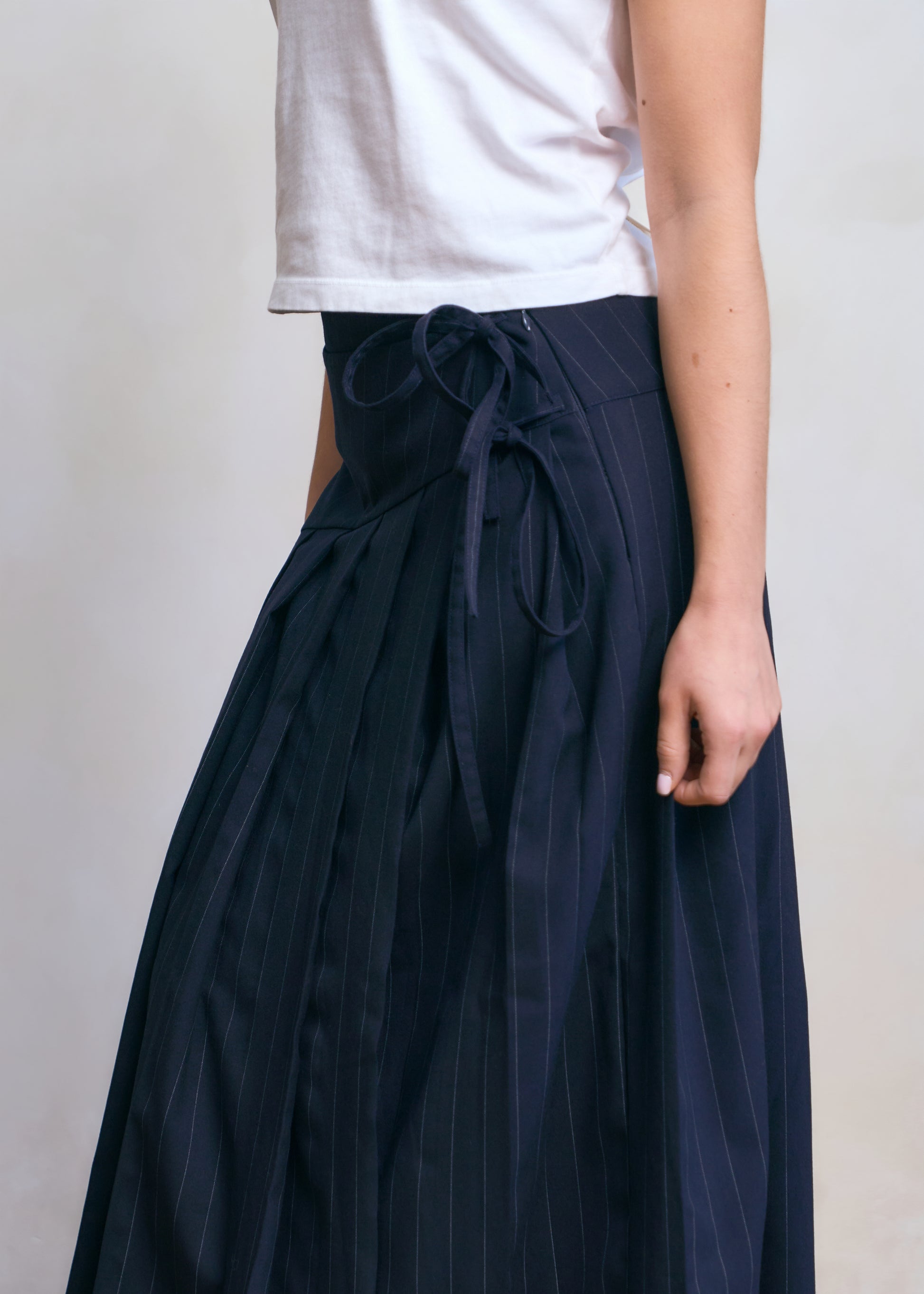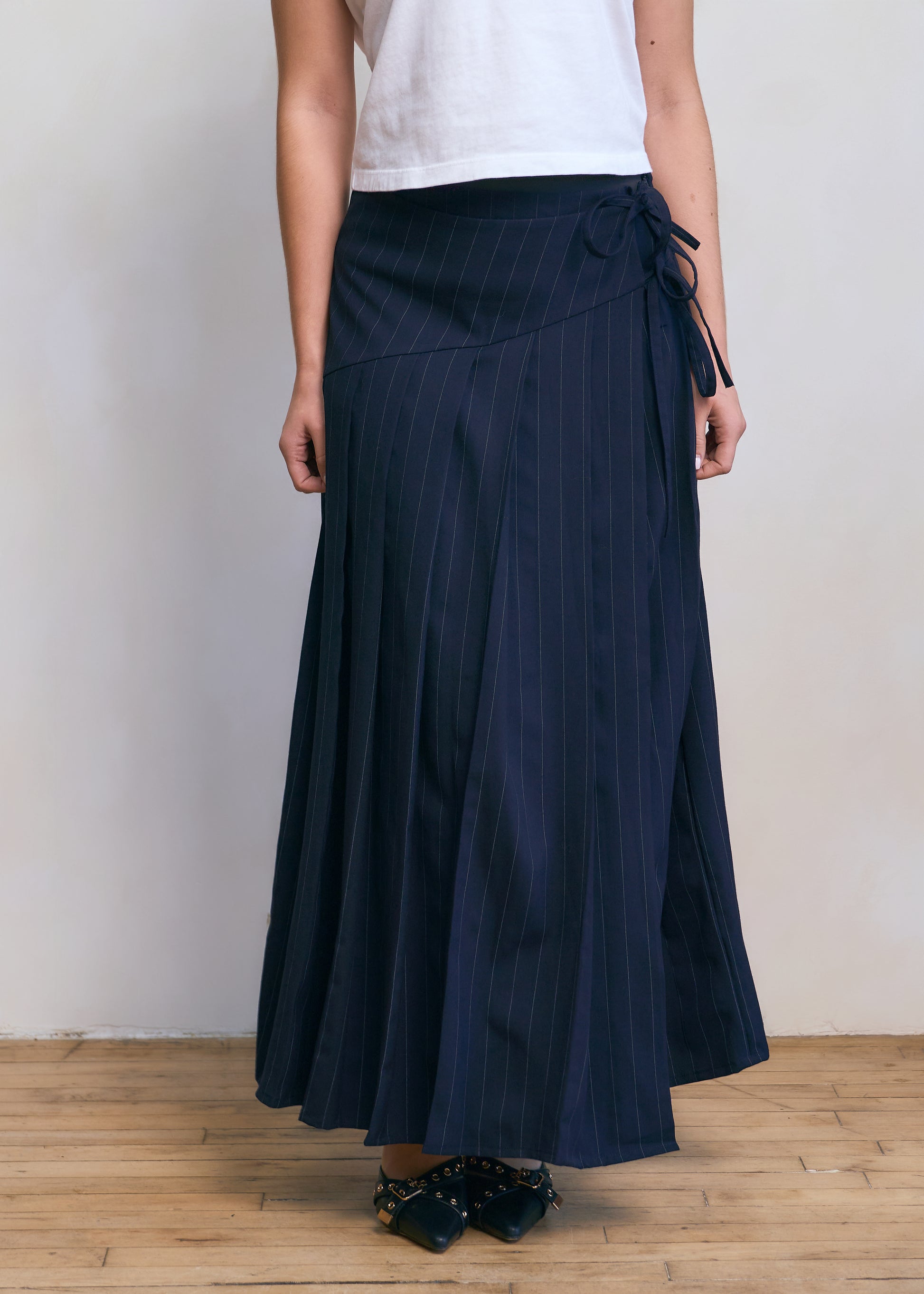Made in our Dhaka Atelier, the Maren Skirt features a fluid wrap silhouette in a deep navy pinstripe that brings refined movement and modern elegance. Its adjustable side ties and soft drape make it a timeless essential for elevated everyday wear.